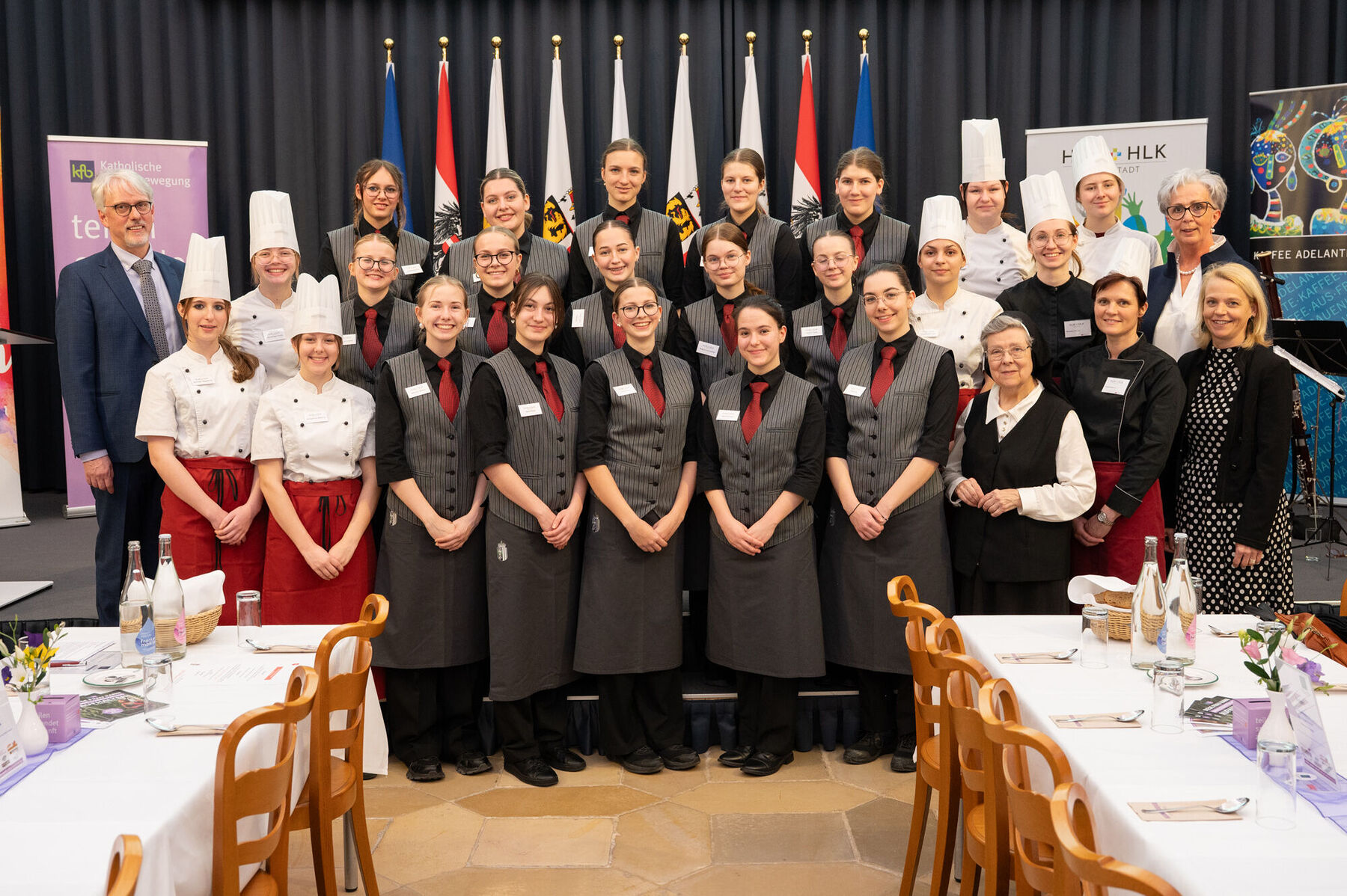 V. l. : Schülerin Marlene Königshofer, FV Regina Pirklbauer (HLW/HLK Freistadt), Michaela Leppen (Leiterin Team Frauen/Diözese Linz), LH Thomas Stelzer, Margit Schmidinger (Vorsitzende kfb oö,) Bischof Manfred Scheuer, Dir. Jürgen Ehling (HLW/HLK Freistadt), Schülerin Maria Steiner. @ Thomas Markowetz