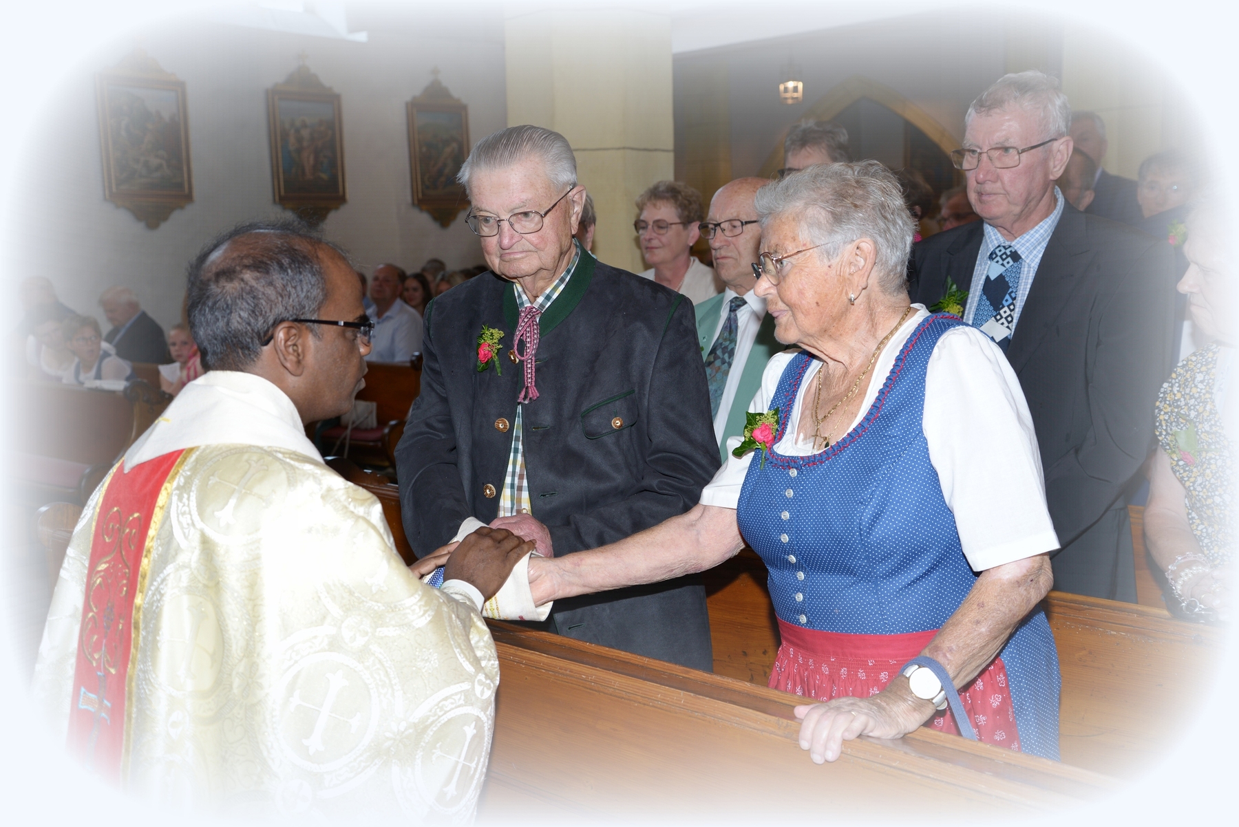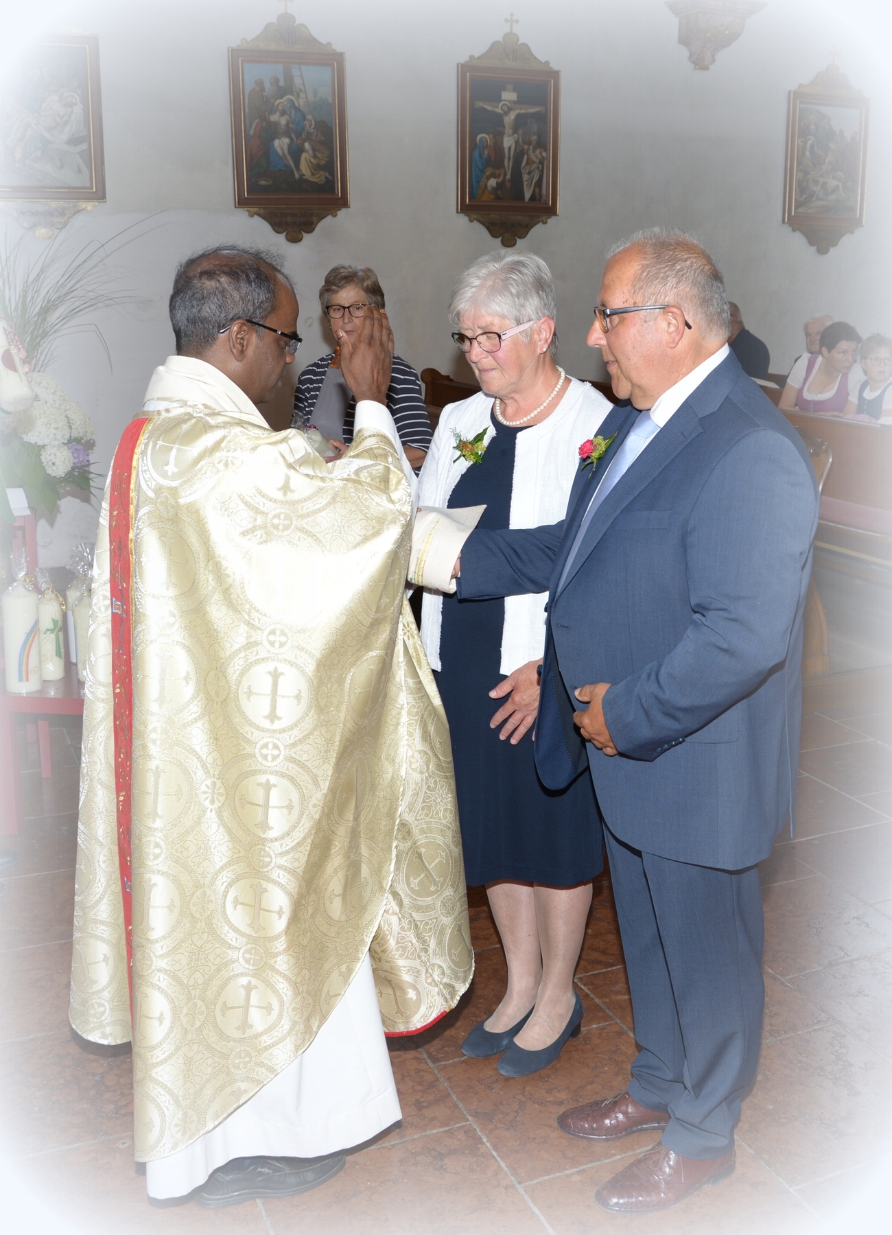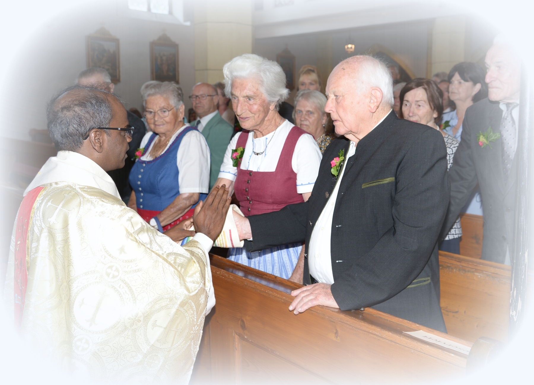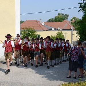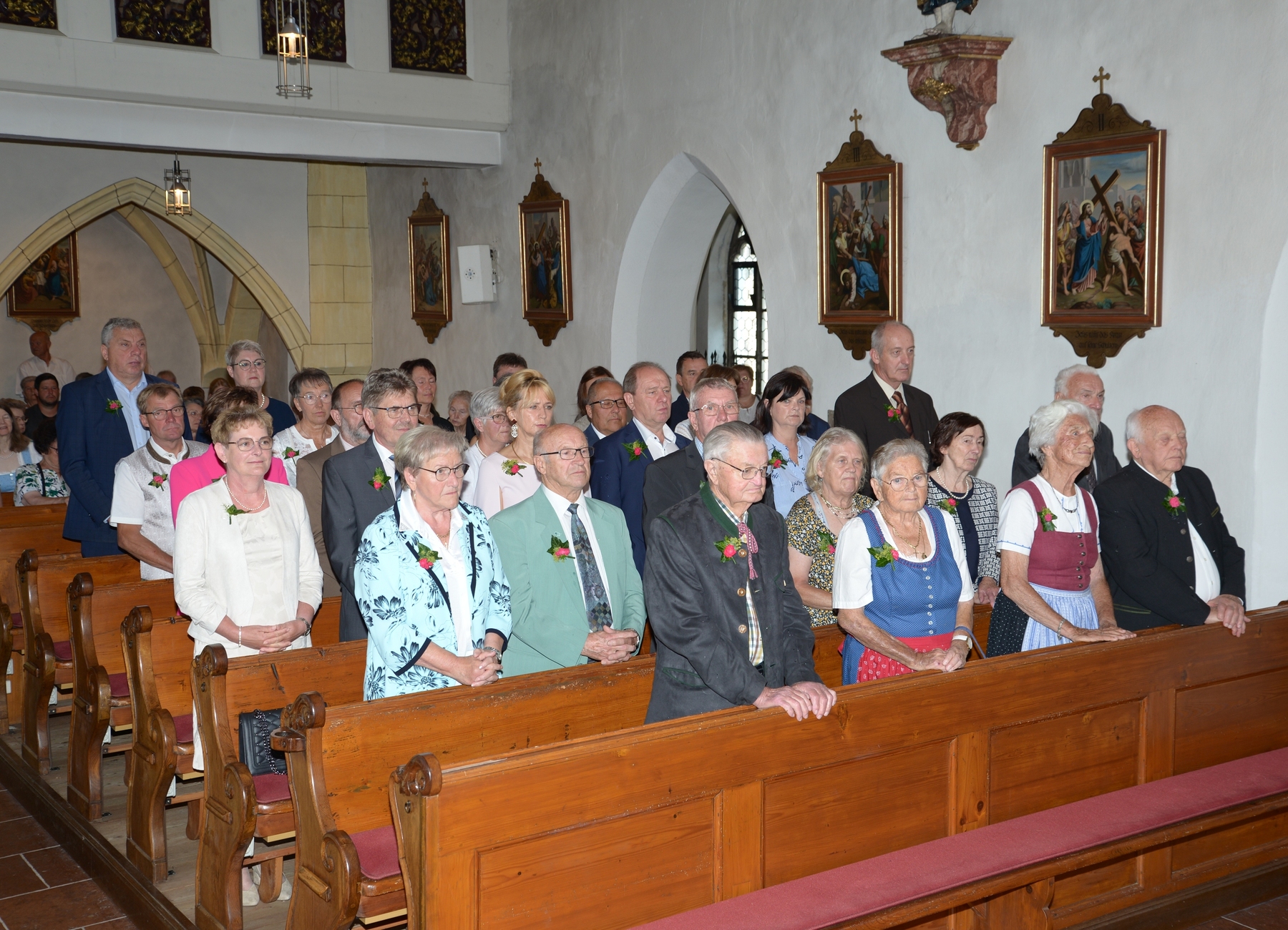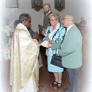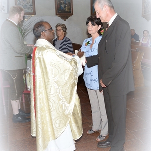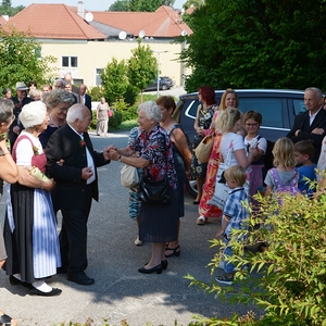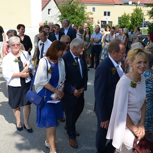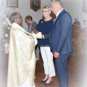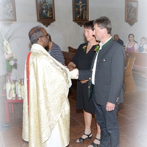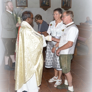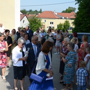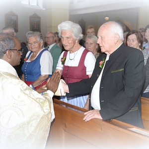 16 Paare, die ihr Ehejubiläum feierten, zogen gemeinsam mit Franz Eschlböck, der sein 60-jähriges Priesterjubiläum feierte, unter Begleitung der Blasmusik zum Festgottesdienst ein. Kaplan Paul hat den Festgottesdienst geleitet und eine ansprechende Festpredigt gehalten. Dieser Festgottesdienst wurde vom Kirchenchor unter der Leitung von Helmut Lang in bewährter Weise musikalisch umrahmt.
