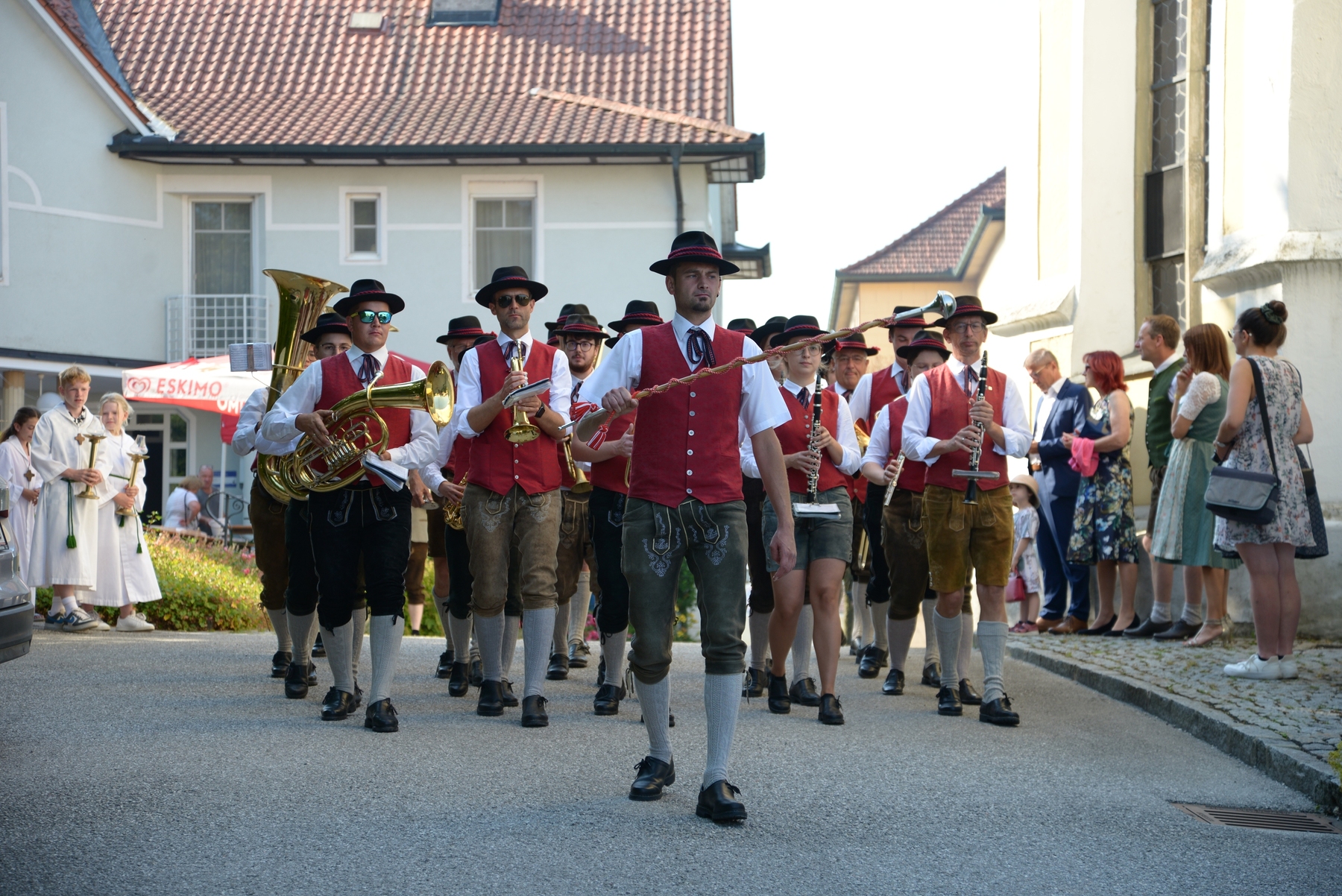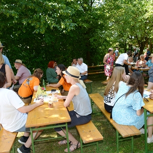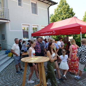 Die Pfarrbevölkerung war im Anschluss an den Gottesdienst in den wunderschönen Pfarrgarten eingeladen. Für das leibliche Wohl war mit einer gschmackigen Kistensau, Bratwürstel, Pizzas und Baguettes gesorgt. Auch die Auswahl an Getränken an der Schank war an dem heißem Sonntagmittag und -nachmittag begehrt. Der Musikverein Prambachkirchen sorgte unter Kapellmeister Florian Lindinger wieder für die musikalische Unterhaltung.