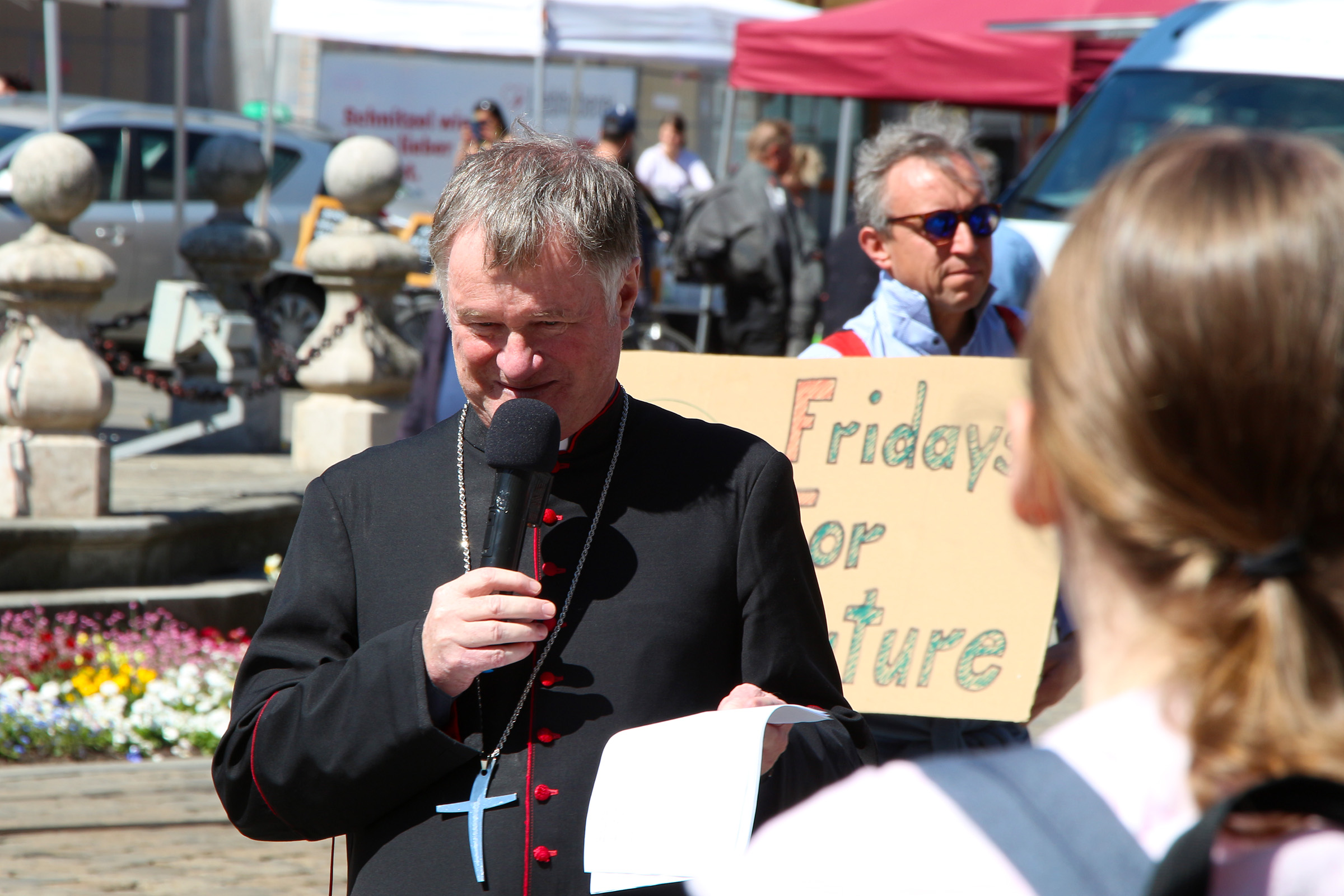 Scheuer dankte zunächst den jungen DemonstrantInnen für ihr Engagement: „Viele von euch haben eigentlich Ferien. Manche haben sich vielleicht extra frei von der Arbeit genommen. Ich danke euch dafür. Das ist keine Selbstverständlichkeit. Auch wenn es um nichts weniger geht als um eine gute Zukunft für euch, für uns alle, für die nächsten Generationen.“ Der Diözesanbischof erläuterte die Bedeutung des Karfreitags als Tag des Gedenkens an Jesu Leiden und Tod am Kreuz, aber auch als Verkörperung der Realität von Scheitern, Verlust und Traurigkeit. Scheuer wörtlich: „Der Karfreitag ist nicht nur ein Tag im Kalender, er ist Teil unseres Lebens mit den tagtäglich erlittenen Übeln, dem Leiden und dem Tod in der Welt von heute, mit Krieg, Gewalt und Zerstörung. Karfreitag, das ist Verdunkelung. Verdunkelung des Guten. Verdunkelung von Gerechtigkeit. Verdunkelung von dem, was sein könnte. Verdunkelung von Zukunft und Hoffnung. Dieses Anliegen verbindet uns heute alle, die wir uns hier versammelt haben. Es verbindet uns über die Religionen hinweg. Schließlich geht es um nichts weniger als um die Zukunft unserer Erde.“ Obwohl die dramatischen Auswirkungen der Klimaveränderungen „mit Händen zu greifen“ seien, blieben die Erfolge bei der Eindämmung des Klimawandels „überschaubar“, kritisierte Scheuer. „Mit ‚Fridays for Future‘ habt ihr es geschafft, dieser Erinnerung auf globaler, aber auch auf lokaler Ebene einen Schub zu geben“, lobte der Bischof das Engagement der jungen DemonstrantInnen.
