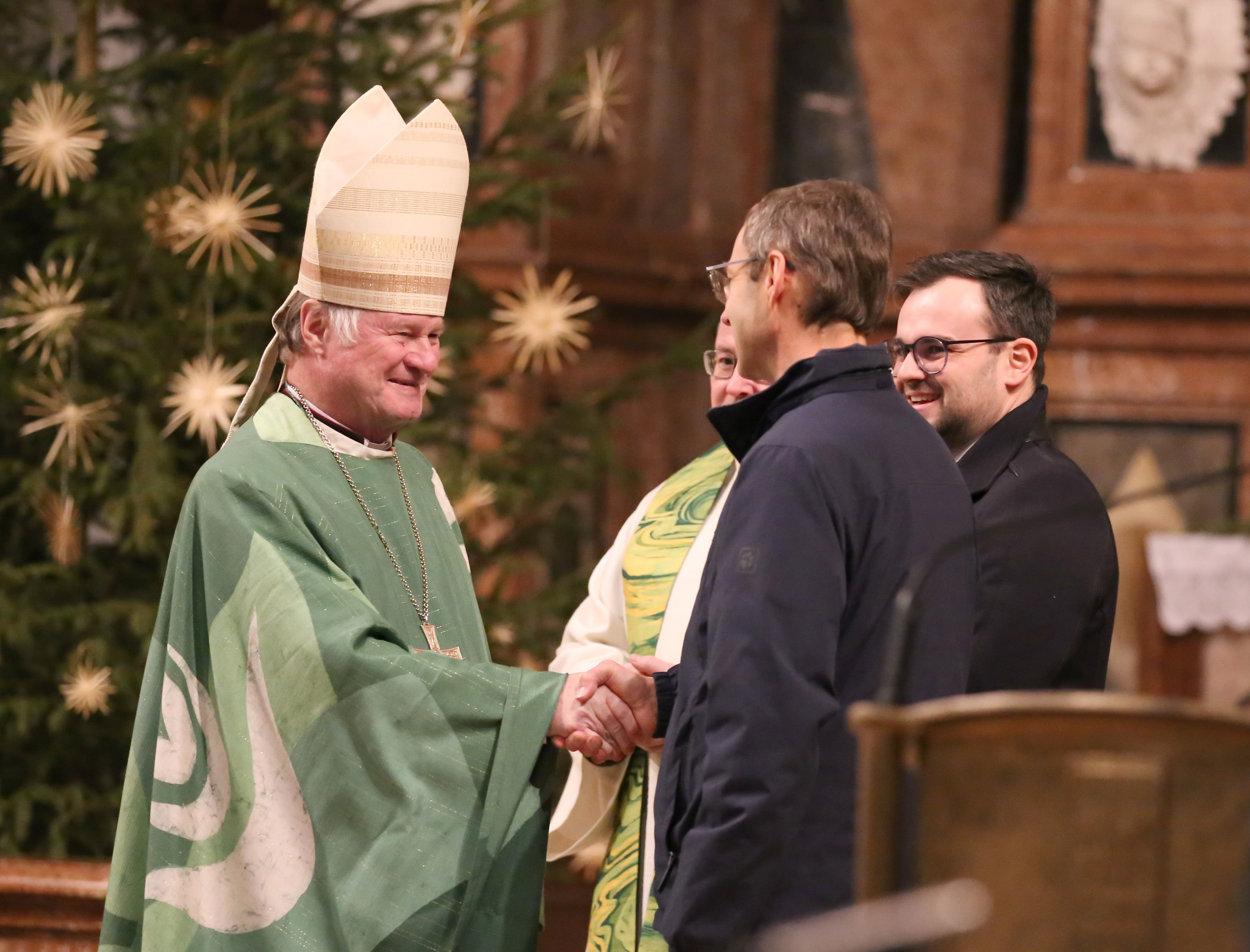 Foto 3: Bischof Scheuer besiegelt die Ernennung von Pfarrer und Pfarrvorständen mit Handschlag.