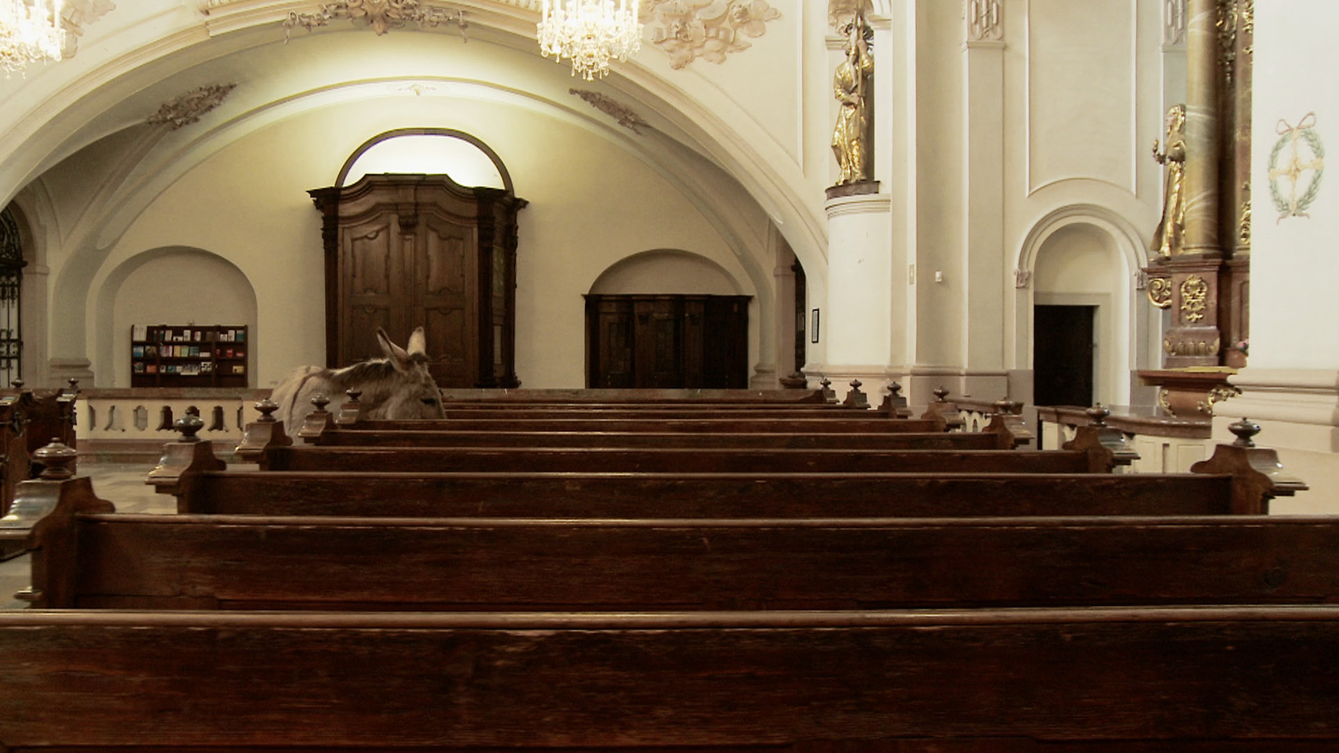 Die langsamen, nahezu meditativ wirkenden Kamerafahrten, durchmessen für einen Zeitraum von etwa 10 Minuten die Raumachse. Zentimeter für Zentimeter wird der Raum mit dem Blick abgetastet. Die Tiere treten nicht als spektakuläre Attraktion auf, vielmehr hat ihr Erscheinen im Kirchenraum etwas Selbstverständliches und zugleich die vorhandene Wirklichkeit Befragendes. Es sind nahezu surreale Szenen, die hier in Erscheinung treten: Während der Kauz auf der Bankablage vor dem kreuztragenden Jesuskind sitzt und mit seinen dunklen Augen gebannt ins Bild blickt, macht sich im Mittelgang des Raumes der Hahn mit seinem leuchtend roten Kamm und dem Krähen, das den Raum erfüllt, stolzierend bemerkbar. Hinter dem Altartisch treten die markanten Hörner der Ziegen plötzlich hervor und in den Kirchenbänken begibt sich ein Esel auf die Suche nach Essbarem. In der Videoinstallation „Das menschliche und das tierische Wesen“ ist die Ursulinenkirche als Kunst- und Kultraum Handlungsort. Die Tiere, die in Dialog mit dem Raum treten und sich als lebendige Wesen dem Raum einschreiben, legen die wesentlichen Parameter von Raum und Handlung in einer verdichteten metaphorischen Weise fest und machen die Frage nach dem Existentiellen, dem menschlichen Wesen in seiner Relation zum Tier, auf eindrucksvolle Weise erfahrbar.