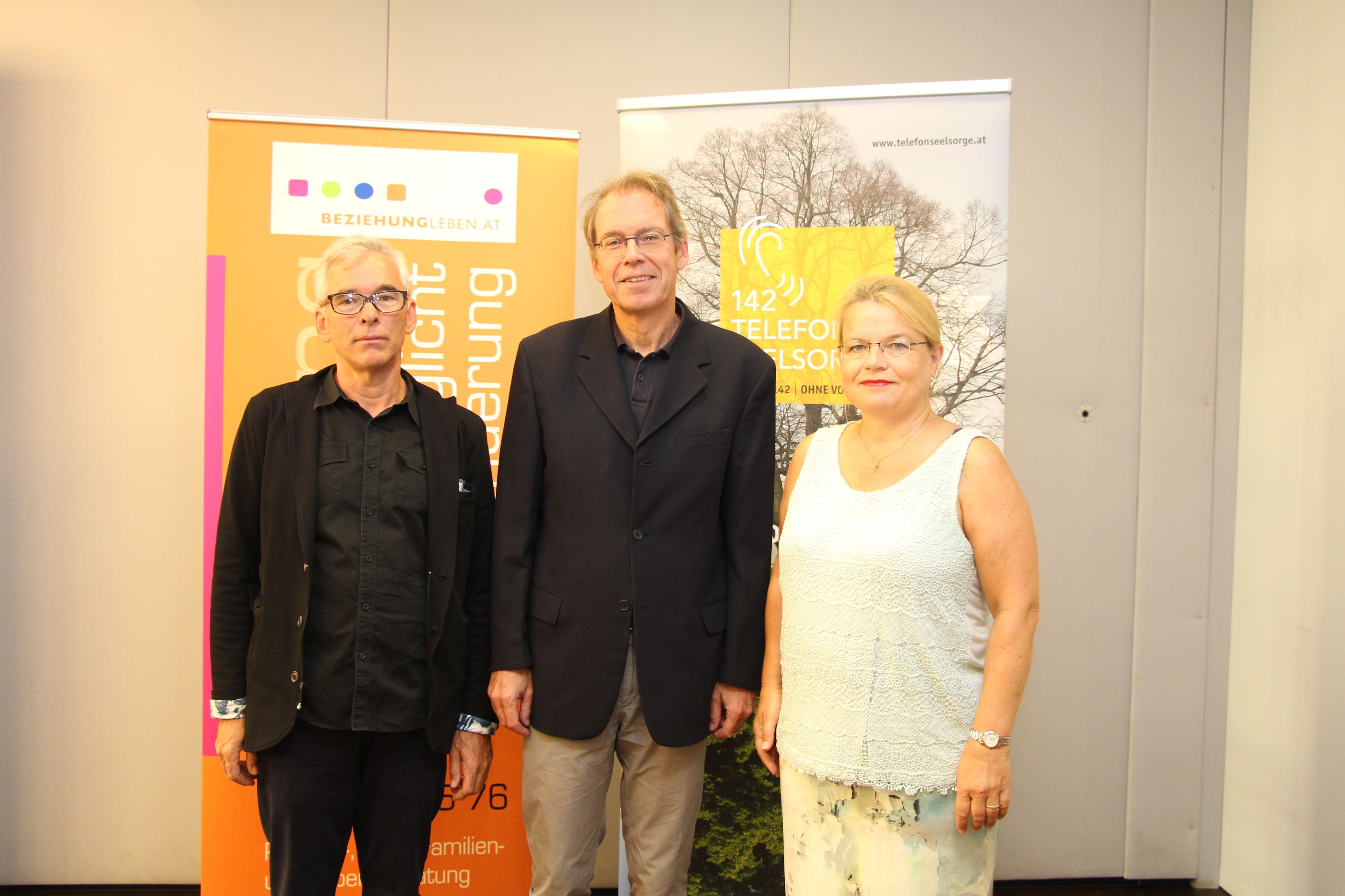 Foto 2: Josef Hölzl MSc. (Dipl. Ehe-, Familien- und Lebensberater und Gewaltberater im Zentrum BEZIEHUNGLEBEN.AT), Dr. Claudius Stein (Leiter des Kriseninterventionszentrums in Wien, Psychotherapeut und Suizidpräventionsforscher) und Mag.a Silvia Breitwieser (Leiterin der TelefonSeelsorge OÖ – Notruf 142).