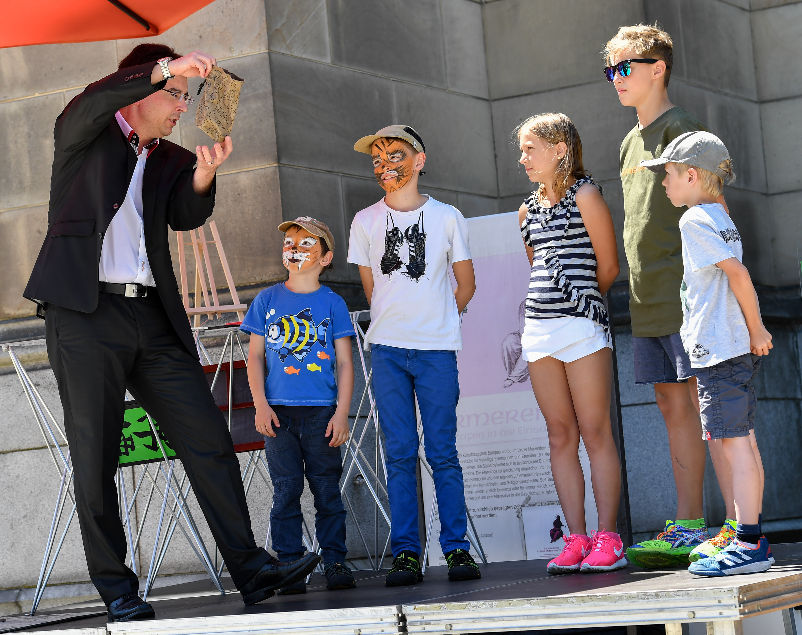 Im Anschluss an den Gottesdienst waren alle Anwesenden zum Weiterfeiern auf dem Domplatz eingeladen. Bei herrlichem Sommerwetter konnten sich die Kinder auf der Hüpfburg, bei den Wasser-Funballs und bei Spielstationen austoben und sich auch schminken lassen. „Magic Priest“ Gert Smetanig brachte große und kleine ZuseherInnen mit seiner Zaubershow zum Staunen und holte auch „Zauberlehrlinge“ als Unterstützung auf die Bühne. Spezielle Domführungen gewährten spannende Einblicke in besondere Bereiche der größten Kirche Österreichs. Die Linzer Band „Blechsalat“ servierte auf der Bühne einen mitreißenden Ohrenschmaus. Einzelne Programmpunkte wurden für gehörlose BesucherInnen in die Gebärdensprache gedolmetscht. Auch für das leibliche Wohl der BesucherInnen war bestens gesorgt. Bei zahlreichen Infoständen konnten sich interessierte BesucherInnen über kirchliche und nichtkirchliche Beratungs- bzw. Unterstützungsangebote und Veranstaltungen für Familien, Kinder, SeniorInnen und schwangere Frauen informieren.