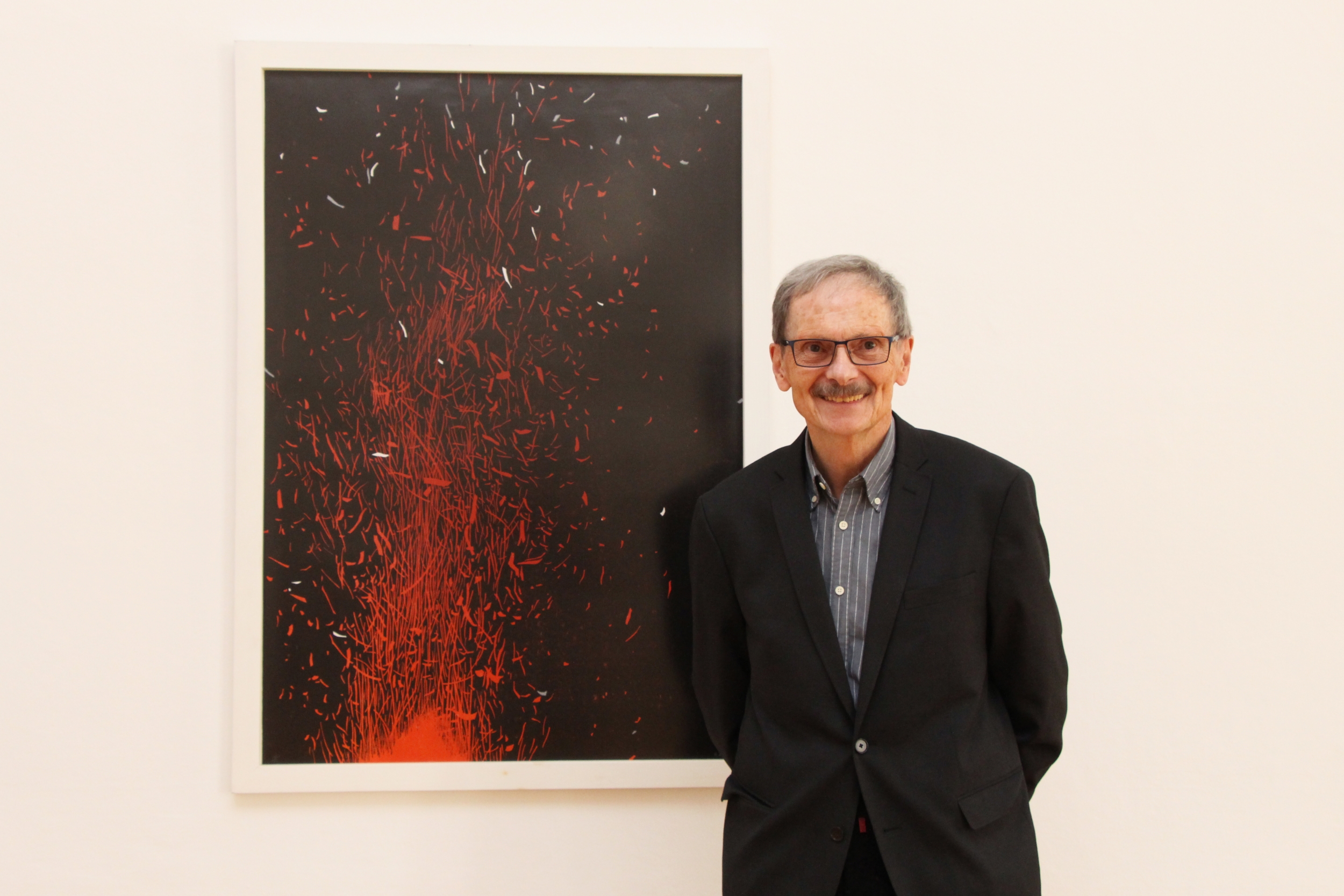 Foto 2: Herbert Friedl vor seinem Werk „Das Element Feuer“ aus dem Zyklus „Vier Elemente“ (Farbholzschnitt, dreifärbig, 116,5 x 80,5 cm, 2009)